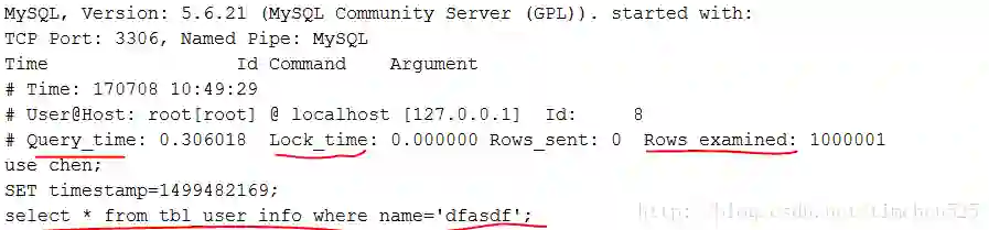 该条语句即是慢查询语句,之后,便可以在相应的日志输出文件或表中去查看是否有该条语句。