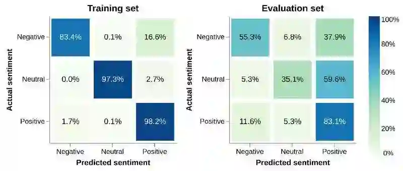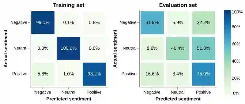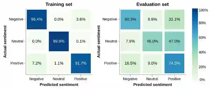 理想情况下,对角线应接近 100%,这意味着几乎所有推文的预测情绪都是正确的,但即使是训练集中,也会存在很大的非对角线元素。这表明了即使模型知道正确的情绪,也会更倾向于在大多数情况下默认预测积极情绪。43% 的消极情绪的推文和 55% 以上的中立情绪的推文被预测为积极情绪。这对于分别为 39% 和 78% 的评估集来说更加槽糕。