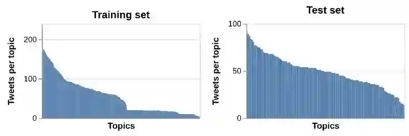 训练集和测试集中与每个主题相关的推文数量。主题基于推文数量从左到右排序,为清晰起见,此处略去了主题的名称。