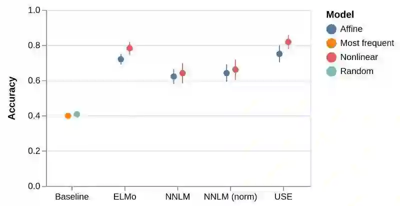 在这里,有很多有趣的观察等待我们去做。首先,在基线之上的任何嵌入的模型都有很大的改进。因此,正如所预期的那样,嵌入这个词捕获了可以用来推导推文情绪的信息。其次,转向 NNLM 嵌入,使用非线性模型似乎并没有什么改进。这很有趣,因为它表明了嵌入空间足够简单,仿射模型能够使用嵌入中所有可用的情绪信息。这与最新的嵌入方法 ELMo 和 USE 形成了对比。在 ELMo 和 USE 中,我们确实观察到在非线性模型的使用情况有所改善,这表明这些模型学习的嵌入空间更加复杂。对于 NNLM,归一化向量确实比非归一化向量有更好的表现趋势,但是在我们的实验中,效果并不显著。最后,虽然 ELMo 和 USE 都包含比 NNLM 嵌入更多的信息,但它们在这些实验中的表现却非常相似。USE 似乎通常包含比 ELMo 略多的信息,但也并没有多多少。然而,这仍然很有趣,因为 USE 嵌入空间的维数比 ELMo 空间要低得多,因此,模型训练速度要快得多。