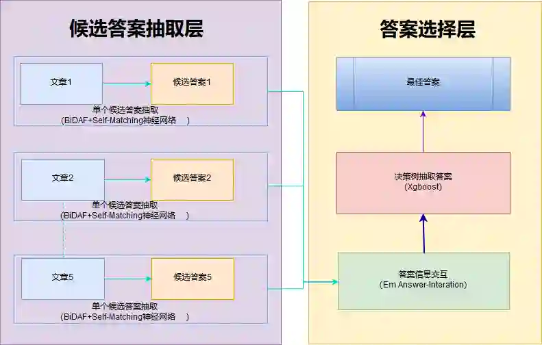 因此我们的模型采用先从每篇文章中独立抽取候选答案,再从候选答案集中抽取最佳答案的结构,以解决多答案致使神经网络难以学习的问题。架构的具体实现中,我们通过BiDAF+ Passage Self-Matching从单篇文章中抽取答案,构成候选答案集,再使用em和xgboost决策树从候选答案集中抽取最佳答案。