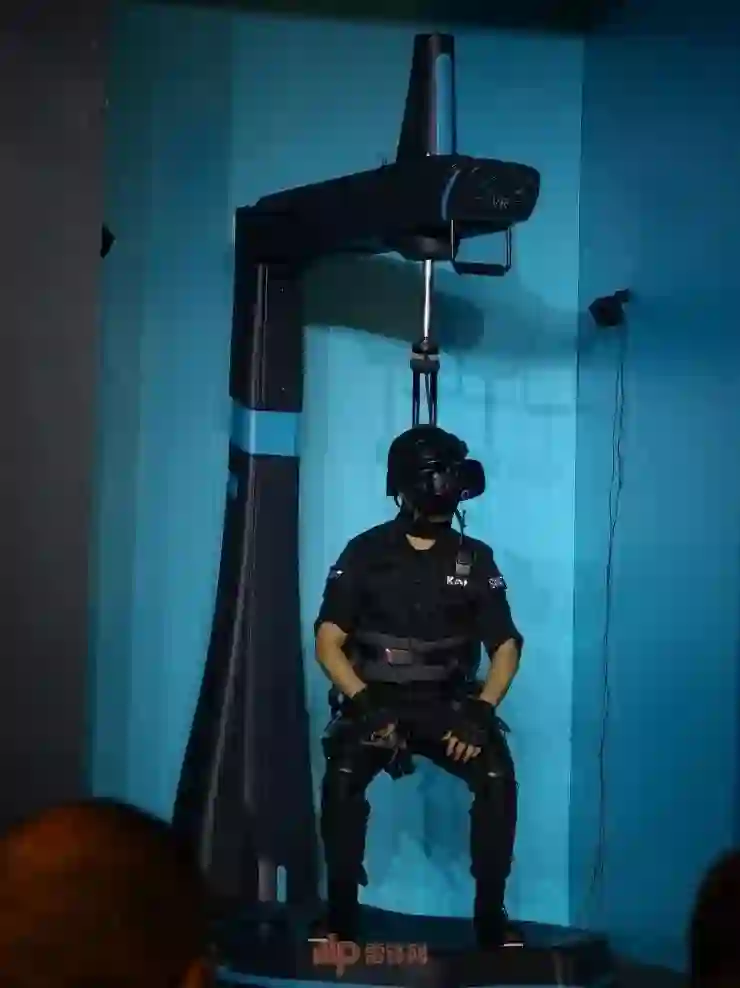 这在影片里用的是力反馈背心,玩家们都穿着它,好体验在游戏里被打的感觉。不过 Bug 就是,影片里经常有角色被击飞的情况,结果镜头一切,现实世界里的主角也被往后击飞了一点点,而且是在没有装吊绳的情况下,真不知道力是从哪里来的,背心是做不到这个的,只能解释成影视效果了。