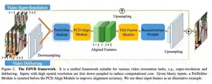 在论文《EDVR: Video Restoration with Enhanced Deformable Convolutional Networks》中,作者介绍了这种新型算法,通过一种新的网络模块 PCD 对齐模块,使用 Deformable 卷积进行视频的对齐,可以实现整个过程端到端的训练;而在挖掘时域(视频前后帧)和空域(同一帧内部)的信息融合时,作者又提出了一种时空注意力模型,来进行更好的信息融合。