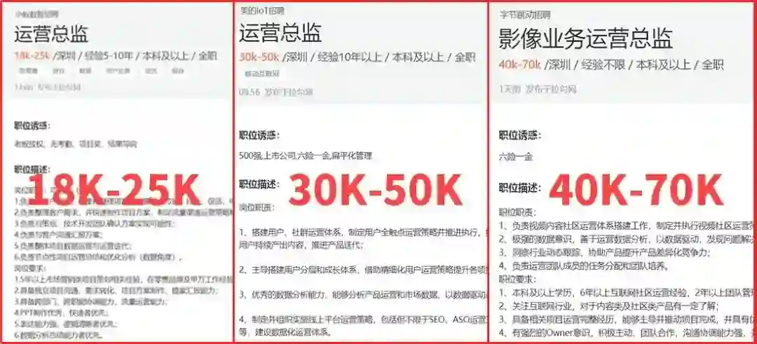 在拉勾上,对比一下当前互联网运营总监的薪资水平和能力要求,着实相差很大,从月薪18k到70k的都有,在同一个岗位下薪资差异如此之大,竞争自然也是如此。