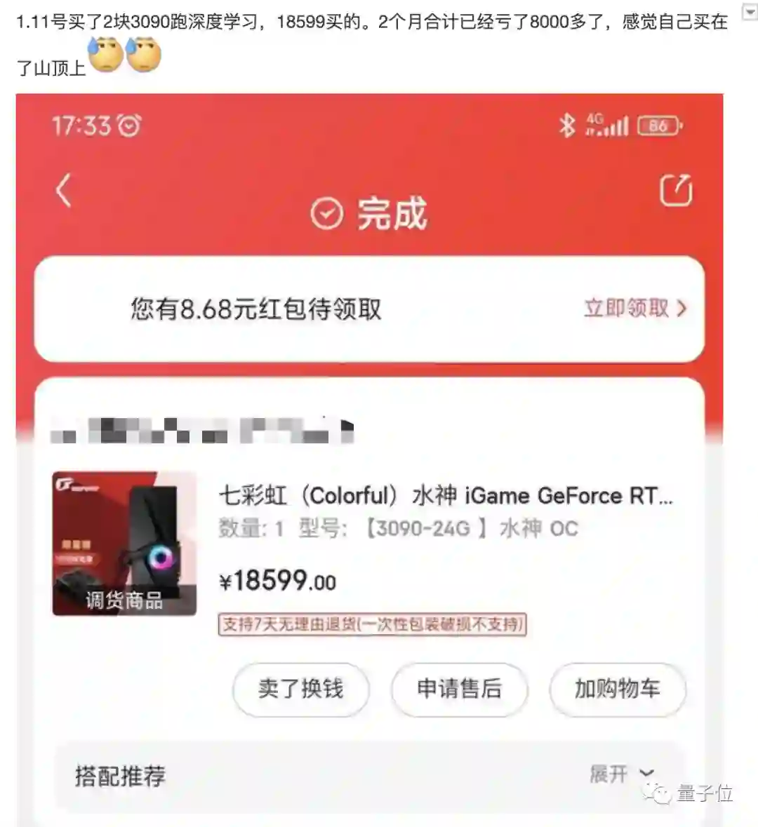 而且这位网友买的还是高端的那种,英伟达GeForce RTX 3090。