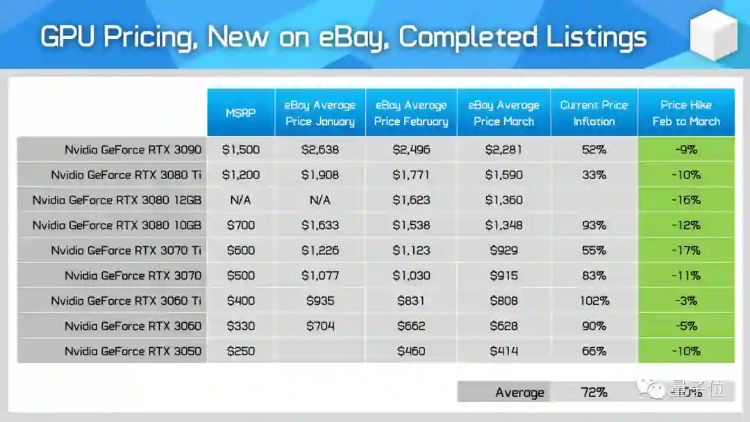 英伟达30系目前整体溢价72%,平均下跌10%: