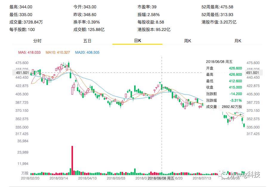 今年初腾讯的股价达到历史高点的475.72港元,不过在过去的半年中,腾讯的股价只能用“跌跌不休”来形容。截止8月15日发布财报的当天,腾讯股价收于336港元,较高峰时期下跌139.72港元。
