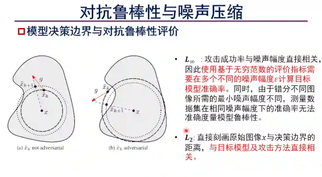 韩教授比较了对抗攻击中两种评价策略。其中基于无穷范数的评价策略在定量噪声幅度下计算攻击方法的攻击成功率。二范数则计算攻击成功所需的最小噪声幅度。通过从对抗空间和集合论两方面的分析可得出结论,基于无穷范数的评价策略能找到的对抗样本是二范数评价策略能找到的对抗样本的真子集,因此在不引入额外限制情况下对噪声幅度的压缩,相对于在人为限定的噪声幅度下判断是否错分,是更优的判断准则。