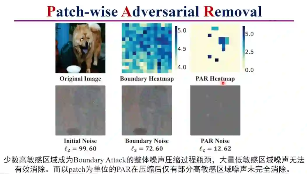 第二个工作是针对ViT的决策黑盒攻击。韩教授介绍了ViT和CNN结构差异导致的对ViT进行黑盒攻击的困难。针对现有黑盒攻击方法的问题,韩教授介绍了首个针对ViT模型的黑盒决策攻击方法PAR。PAR使用高斯噪声生成初始对抗样本,使用两个掩模分别记录当前对抗样本的噪声幅度和噪声敏感性,寻找噪声消除价值最高的patch进行压缩。