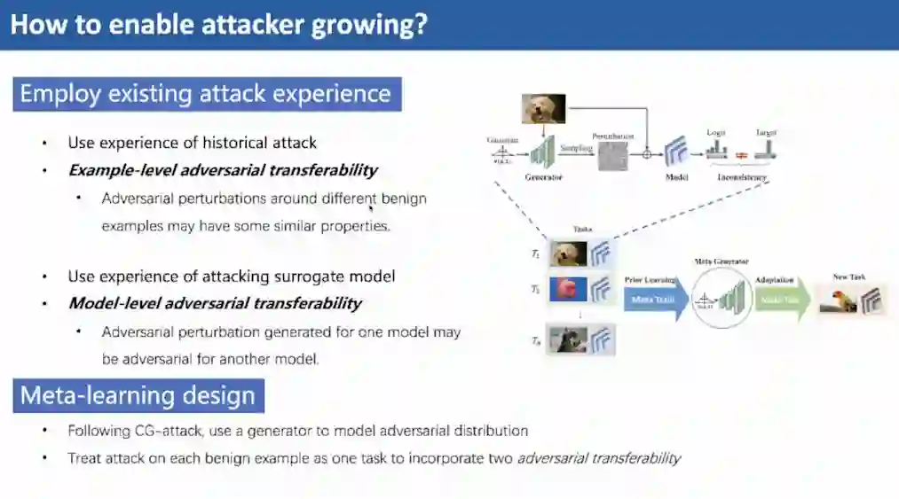 吴教授提出一种基于元学习的MCG方法,使用meta training对对抗样本的分布建模,并且将每次攻击当作一个新的任务,将当前分布对新的任务微调以提升攻击效果该工作发表在TPAMI 2022上。