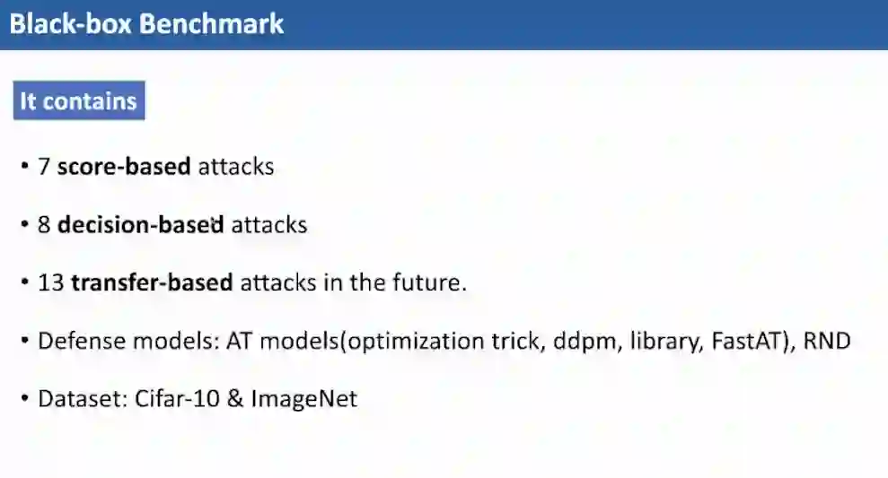 最后,吴教授介绍了一种可用于度量黑盒攻击方法性能的benchmark。这是一个整合了多种攻击方法的工具库,可以帮助人工智能安全领域的学习者快速入门。