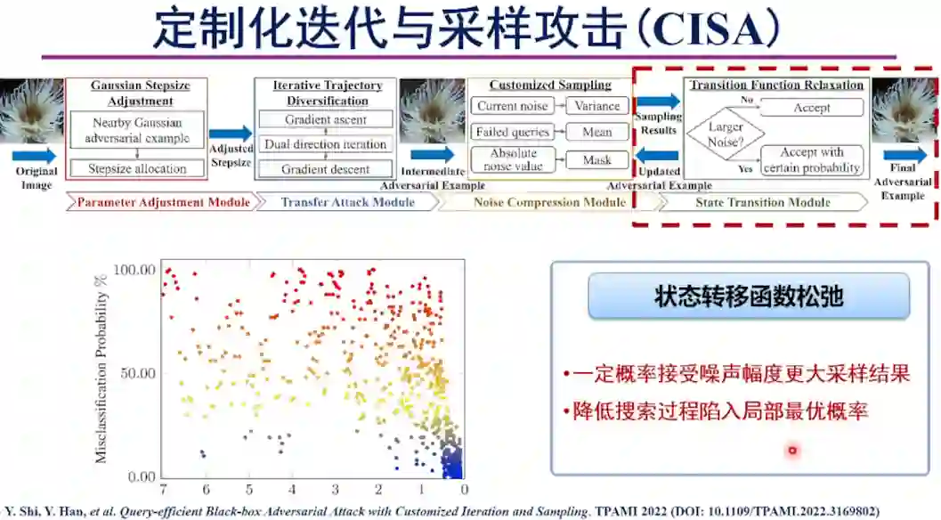 在新的黑盒攻击框架的基础上,韩教授介绍了定制化迭代与采样攻击。该方法中包含高斯步长调整、迭代轨迹多样化、定制化采样和状态转移函数松弛四个步骤。该工作发表在TPAMI 2022上。