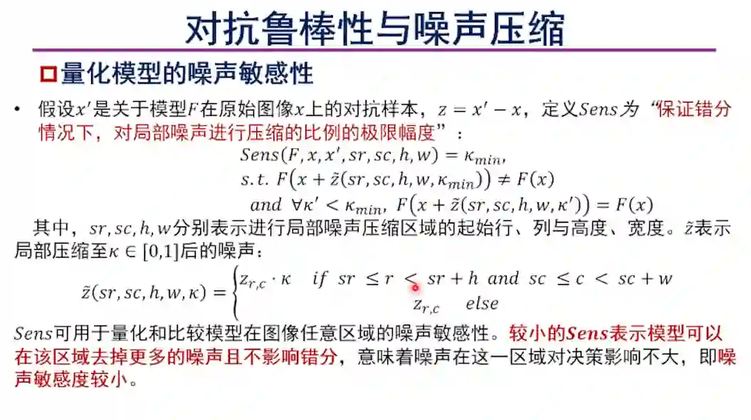 韩教授进一步对模型的噪声敏感性进行了定义,使用“保证错分情况下,对局部噪声进行压缩的比例的极限幅度”对模型的噪声敏感性进行了量化,并比较了CNN和ViT两类模型的噪声敏感性。韩教授介绍了在噪声敏感性定义的基础上关于噪声敏感性与决策攻击成功率的定理,结论为噪声压缩的失败更有可能是图像的高敏感区域导致的。