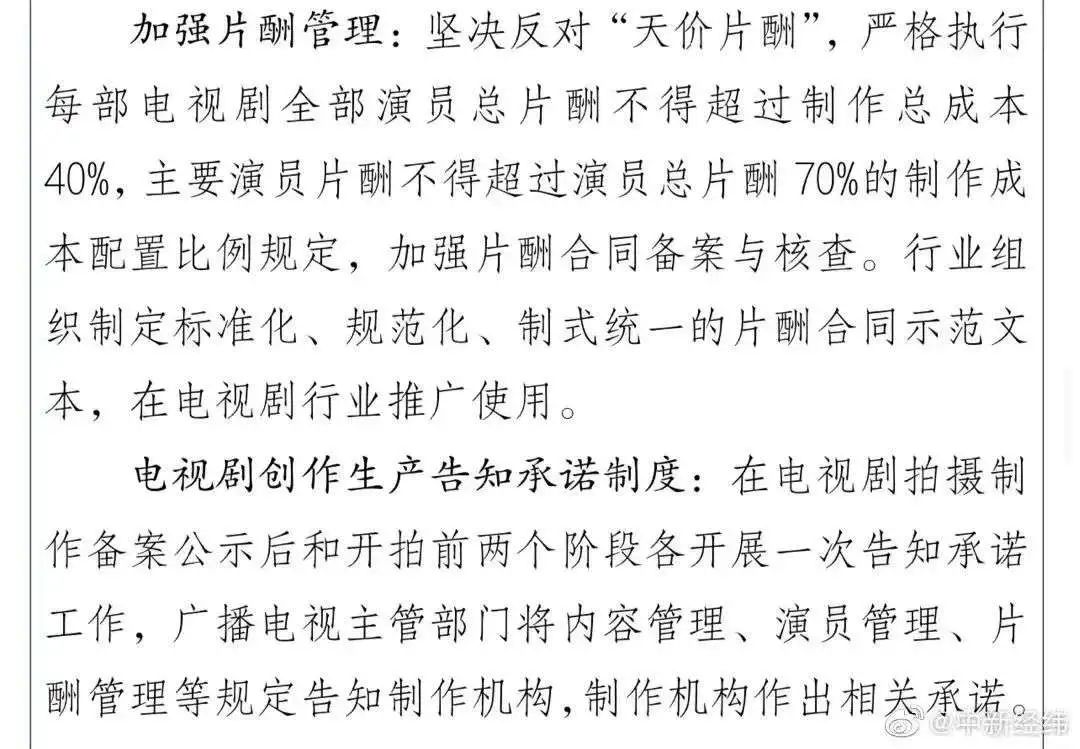广电总局:演员总片酬不得超过制作成本40%,主演片酬不得超过总片酬70%