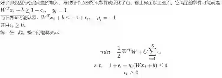你发现目标函数里面多了一点东西,而加上这个是合理的,我们在优化的同时,也使得总的松弛变量之和最小。常数C决定了松弛变量之和的影响程度,如果越大,影响越严重,那么在优化的时候会更多的注重所有点到分界面的距离,优先保证这个和小。好了将问题写在一起吧: