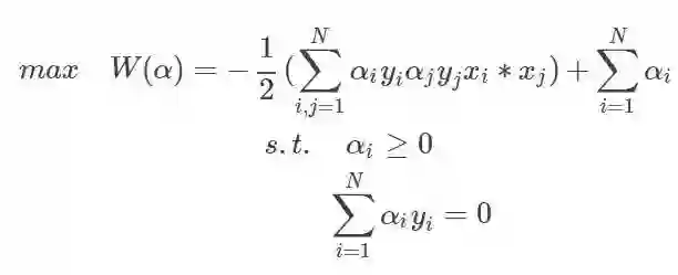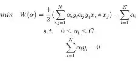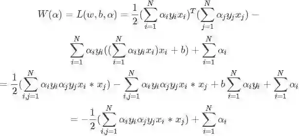 那么求解最最开始的函数的最小值等价到这一步以后就是求解W的最大值了,因为使用了拉格朗日乘子法后,原问题就变为其对偶问题了,最小变成了最大,至于为什么,等到详细研究过对偶问题再来解释吧。不了解的,只需要知道求W的极值即可。整理一下,经过这么一圈的转化,最终的问题为: