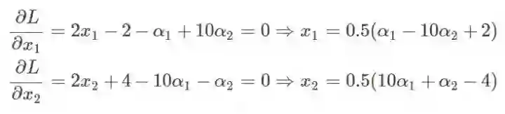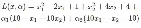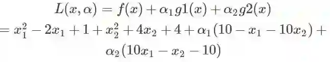 把它在带到约束条件中去,可以看到,2个变量两个等式,可以求解,最终可以得到,这样再带回去求x就可以了。那么一个带等式约束的优化问题就通过拉格朗日乘子法完美的解决了。那么更高一层的,带有不等式的约束问题怎么办?那么就需要用更一般化的拉格朗日乘子法即KKT条件来解决这种问题了。