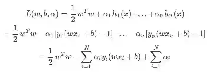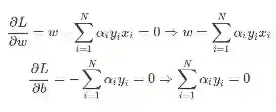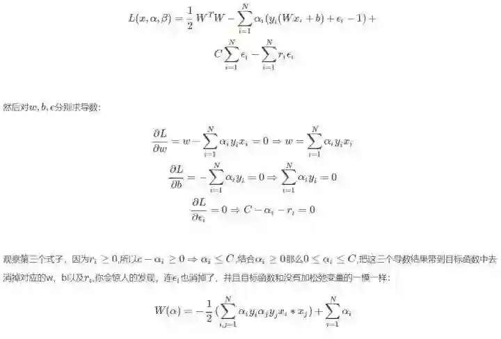 好了得到上面的两个公式,再带回L中把去w和b消掉,你又可能发现,w确实可以消,因为有等式关系,那b怎么办?上述对b求导的结果竟然不含有b,上天在开玩笑吗?其实没有,虽然没有b,但是有那个求和为0呀,带进去你会惊人的发现,b还真的可以消掉,就是因为了那个等式。简单带下: