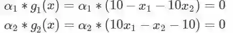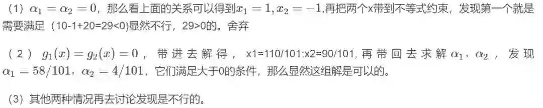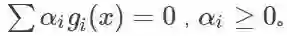 那么如果不管呢?因为g1(x)与g2(x)已经在边缘了,所以取它的梯度是一定会让目标函数变好的。综合来看,这个时候我们就不选g3。那么再往下走,假设到了自变量优化到了x3,这个时候发现g2(x)与g3(x)等于0,也就是走到边了,而g1(x)小于0,可变化的空间绰绰有余,那么这个时候举要取g2(x)与g3(x)的梯度方向作为变化的方向,而不用管g1(x)。那么一直这样走呀走,最终找到最优解。可以看到的是,上述如果g1(x)、g2(x)=0的话,我们是需要优化它的,又因为他们本身的条件是小于0的,所以最终的公式推导上表明,是要乘以一个正系数作为他们梯度增长的倍数,而那些不需要管的g(x)为了统一表示,这个时候可以将这个系数设置为0,那么这一项在这一次的优化中就没有了。那么把这两种综合起来就可以表示为
