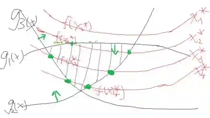 这个时候,我们发现在x2的基础上再寻找一组更优解要靠谁呢?当然是要靠约束条件g1(x)与g2(x),因为他们等于0了,很极限呀,一不小心,走错了就不满足它们两了,这个时候我们会选择g1(x)与g2(x)的梯度方向往下走,这样才能最大程度的拜托g1(x)与g2(x)=0的命运,使得他们满足小于0的约束条件对不对。至于这个时候需不需要管g3(x)呢?正常来说管不管都可以,如果管了,也取g3在x2处的梯度的话,因为g3已经满足了小于0的条件,这个时候在取在x2处的梯度,你能保证它是往好的变了还是往差的变了?答案是都有可能。运气好,往好的变了,可以更快得到结果,运气不好,往差的变了,反而适得其反。