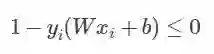 某一次迭代后,分类面为粗蓝线所示,上下距离为1的分界面如细蓝线所示,而理想的分界面如紫虚线所示。那么我们想想,要想把粗蓝线变化到紫虚线,在这一次是哪些个点在起作用?很显然是界于细蓝线边上以及它们之间的所有样本点在起作用吧,而对于那些在细蓝线之外的点,比如正类的四个圈和反类的三个叉,它们在这一次的分类中就已经分对了,那还考虑它们干什么?所以这一次就不用考虑这些分对了的点。那么我们用数学公式可以看到,对于在这一次就分对了的点,它们满足什么关系,显然