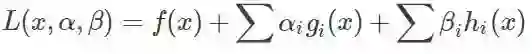 其中g是不等式约束,h是等式约束(像上面那个只有不等式约束,也可能有等式约束)。那么KKT条件就是函数的最优值必定满足下面条件: