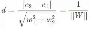 好了再看看D=d1+d2怎么求吧,假设分界面W'X+b=0,再假设X是两维的,那么分界面再细写出来就是:W1'X1+W2'X2+b=0。上分界线:W1'X1+W2'X2+b=1,这是什么,两条一次函数(y=kx+b)的曲线是不是,那么初中就学过两直线的距离吧,