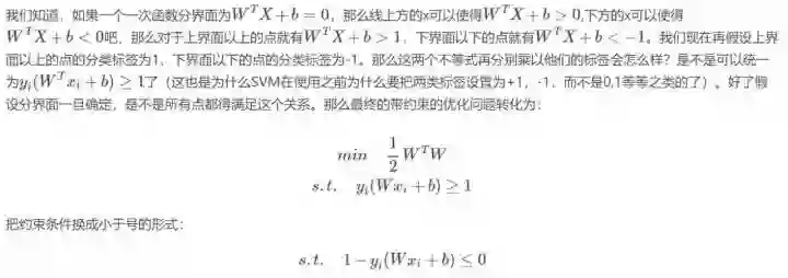 注意的是这可不是一个约束条件,而是对所有的每个样本xi都有一个这样的约束条件。转换到这种形式以后是不是很像上节说到的KKT条件下的优化问题了,就是这个。但是有一个问题,我们说上节的KKT是在凸函数下使用的,那么这里的目标函数是不是呢?答案是的,想想W'*W,函数乘出来应该很单一,不能有很多极点,当然也也可以数学证明是的。