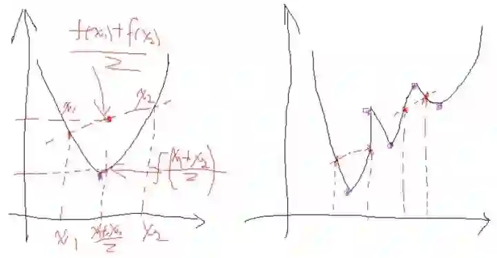 这是一个带等式约束的优化问题,有目标值,有约束条件。那么想想假设没有约束条件这个问题是怎么求解的呢?是不是直接f对各个x求导等于0,,解x就可以了,可以看到没有约束的话,求导为0,那么各个x均为0吧,这样f=0了,最小。但是x都为0不满足约束条件呀,那么问题就来了。这里在说一点的是,为什么上面说求导为0就可以呢?理论上多数问题是可以的,但是有的问题不可以。如果求导为0一定可以的话,那么f一定是个凸优化问题,什么是凸的呢?像下面这个左图: