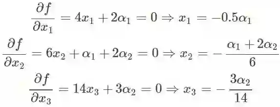 这里可以看到与相乘的部分都为0,所以的取值为全体实数。现在这个优化目标函数就没有约束条件了吧,既然如此,求法就简单了,分别对x求导等于0,如下: