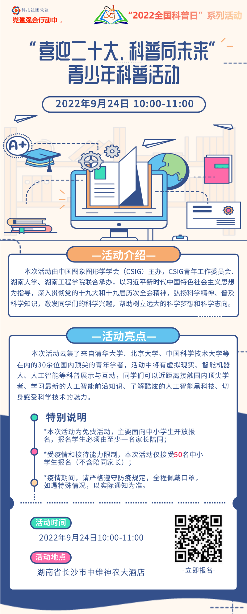为切实发挥学会党组织的政治引领作用,提高公众科学素养,在2022年全国科普日即将到来之际,由中国图象图形学学会主办,学会青年工作委员会、湖南大学、湖南工程学院联合承办的“党建+科普”线下活动将在青年科学家会议期间(2022年9月24日上午10:00-11:00,长沙中维神农大酒店)举办。