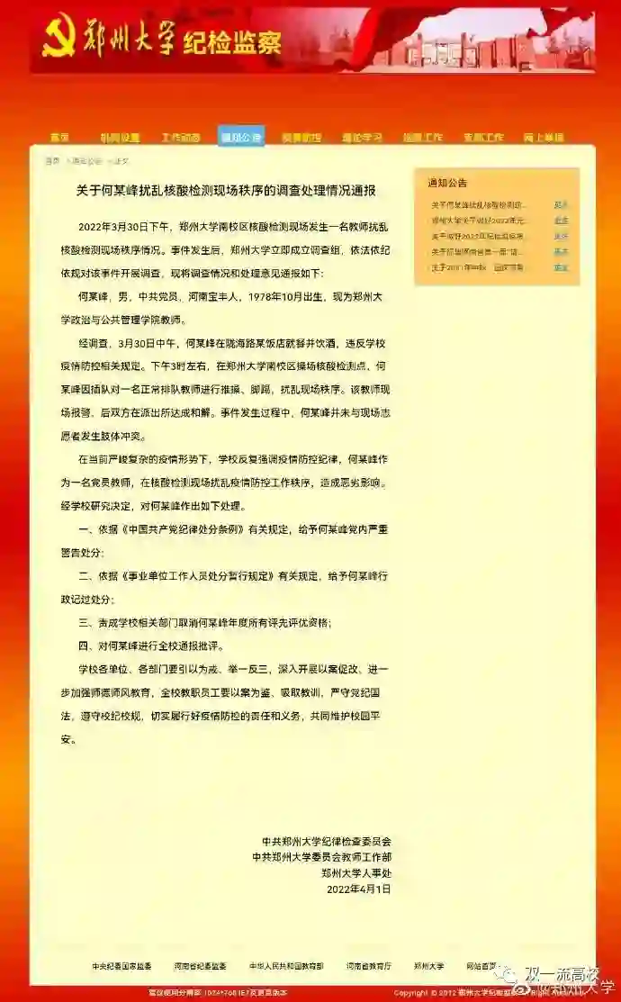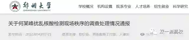 在当前严峻复杂的疫情形势下,学校反复强调疫情防控纪律,何某峰作为一名党员教师,在核酸检测现场扰乱疫情防控工作秩序,造成恶劣影响。经学校研究决定,对何某峰作出如下处理。