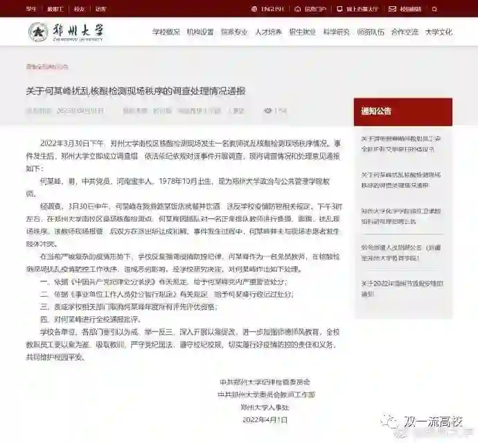 涉事人何某峰系政治与公共管理学院教师,因违反学校疫情防控相关规定,经学校研究决定,给予何某峰党内严重警告处分及行政记大过处分,并取消年度所有评先评优资格,进行全校通报批评。
