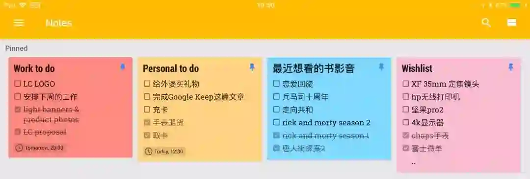 置顶功能对于笔记应用来说并不新鲜,而 Google Keep 的彩色卡片设计为这个功能带来了更好的体验。它们看上去就如同钉在白板上的小纸条一样,小纸条的内容是 to-do list 加上特定的时间和地点提醒,这大概就是所谓的 seamless experience 吧。