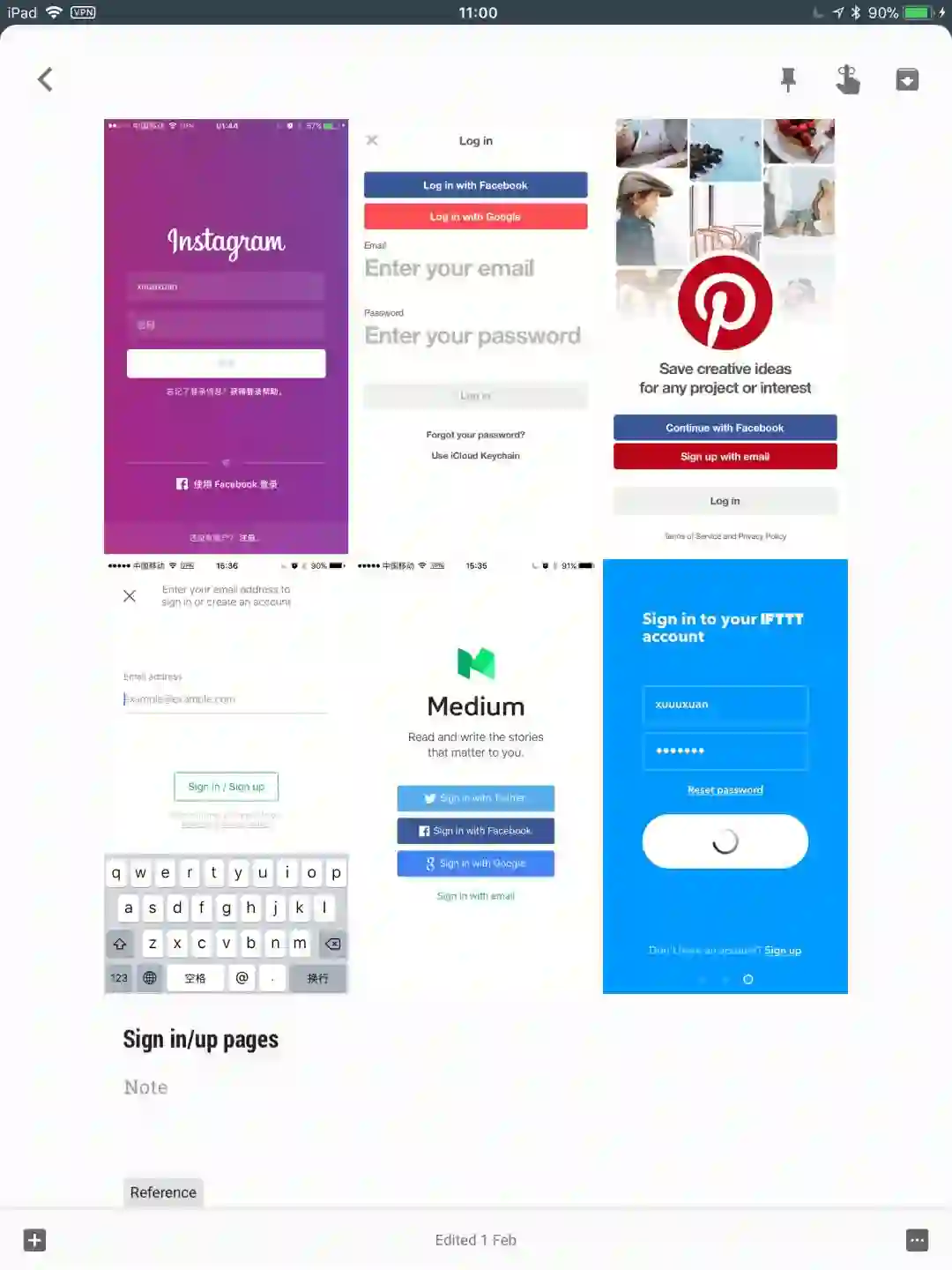 我用 Google Keep 收藏 App 的时候,顺便把截图也添加进去,得到了意想不到的效果。在 Keep 的单个笔记中添加多张图片,它会把所有图片都排列在一起显示,这样能让我非常直观地阅览所有截图以获取灵感。比如下面这个例子:我把经典的 App 登录注册界面都收集到一个笔记里面,做设计的时候拿出来看看收获颇多。