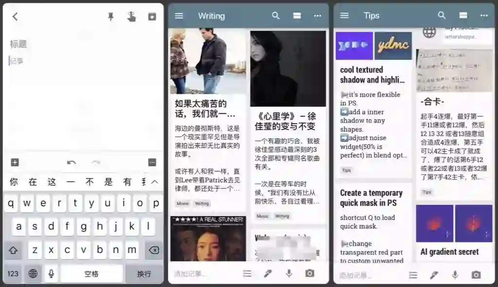 影评、乐评、歌词等等这些不需要什么排版格式的文字内容挺适合用 Google Keep 编辑。它本身既不支持富文本编辑,也不支持 Markdown 语法,这是一种限制,某种程度上也是优势。Google Keep 保持了足够轻爽的编辑界面,无法调整任何格式,码字的时候除了思考自己编辑的内容,最多就是想一下怎么分段。