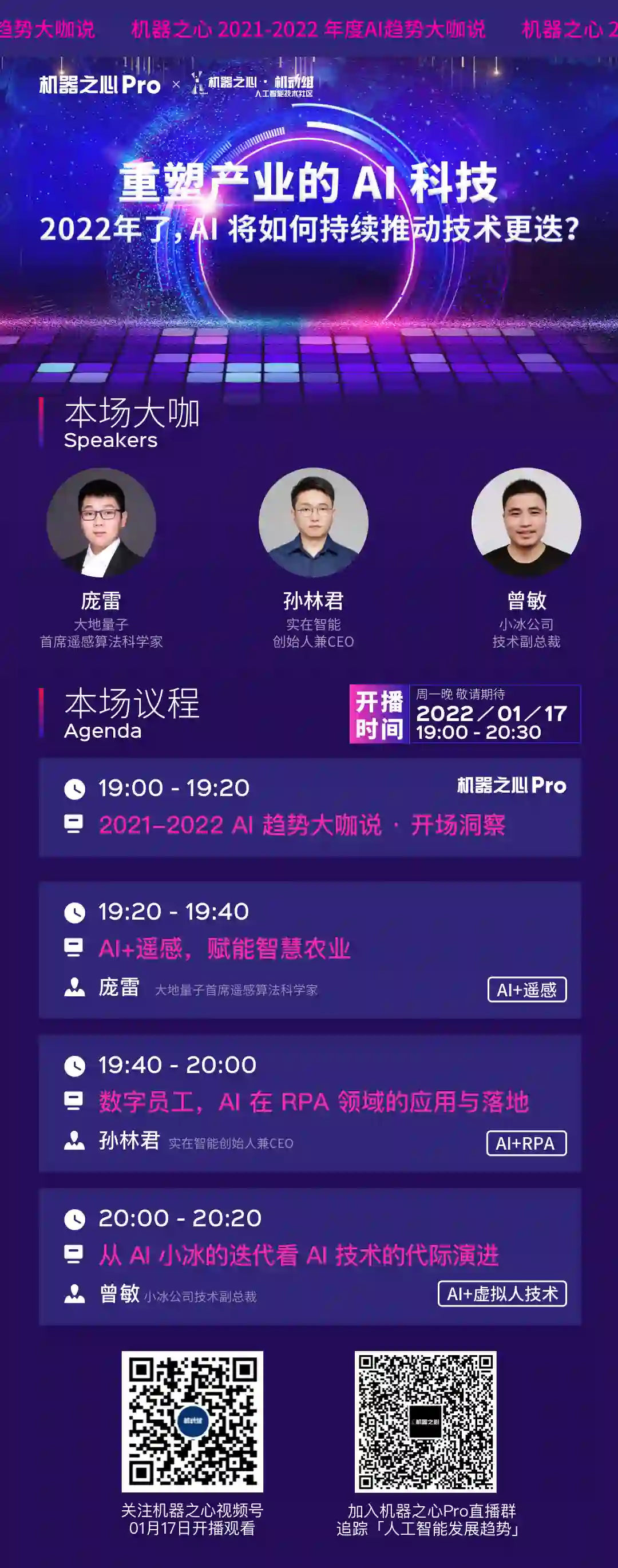 作为「与 AI 俱进,化时光为翎」机器之心 2021-2022 跨年特别策划中的重要组成部分,「机器之心 2021-2022 年度 AI 趋势大咖说」聚焦「驱动未来的 AI 技术」与「重塑产业的 AI 科技」,推出线上分享,邀请行业精英、读者、观众共同,回顾 2021 年中的重要技术和学术热点,盘点 AI 产业的年度研究方向以及重大科技突破,展望 2022 年度 AI 技术发展方向、AI 技术与产业科技融合趋势。 本次线上分享会为期两周,分为两个主题周,第一周主题为「重塑产业的 AI 科技」,将于 2022 年 1 月 17 日——2022 年 1 月 21 日期间分为五期进行,来自博世中国、小冰公司、大地量子、实在智能、天壤智能、来也科技、亮亮视野等近 20 家企业的大咖嘉宾将分别做客「机器之心 2021-2022 年度 AI 趋势大咖说」直播间,围绕「技术升级」、「产业革新」两大方向,「企业 IT」、「AI for Science」、「智能驾驶与出行」等三大人工智能重点应用产业的发展趋势,尽可能的呈现 AI 未来的发展脉络。