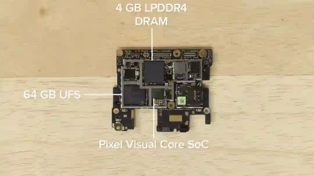 怎么办呢?我们可以从历史经验里找一点灵感。比如作为计算摄影先驱的谷歌,其实很早就发现 SoC 并不能满足 HDR 照片多帧合成的算力需求,于是在2017年发布的 Pixel 2 系列上搭载了一颗定制图像芯片:Pixel Visual Core。它让 HDR 的运算速度提升了 5 倍,功耗却只有通用 SoC 的十分之一。