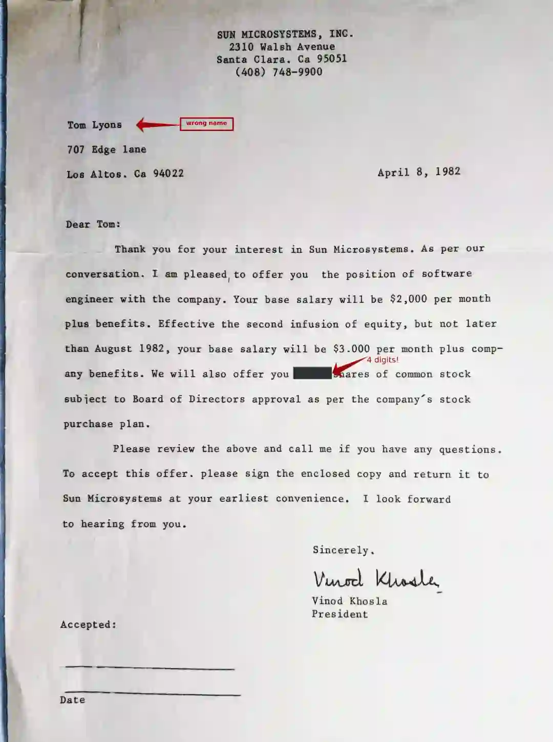 所以我就接下了 Vinod 发的 offer,并在入职前跟他谈了谈股票期权的问题。他相当诚恳地给了个相当诱人的数字,应该是因为其他人都要得很多、所以到我这就直接照此办理了。总之,结果很不错,我决定正式入职。