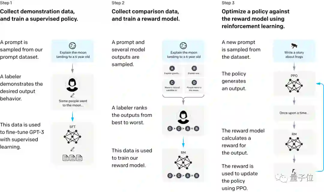 第三步,使用RM作为奖励函数,近端策略优化(PPO)算法微调GPT-3策略,以强化学习方法最大化奖励。