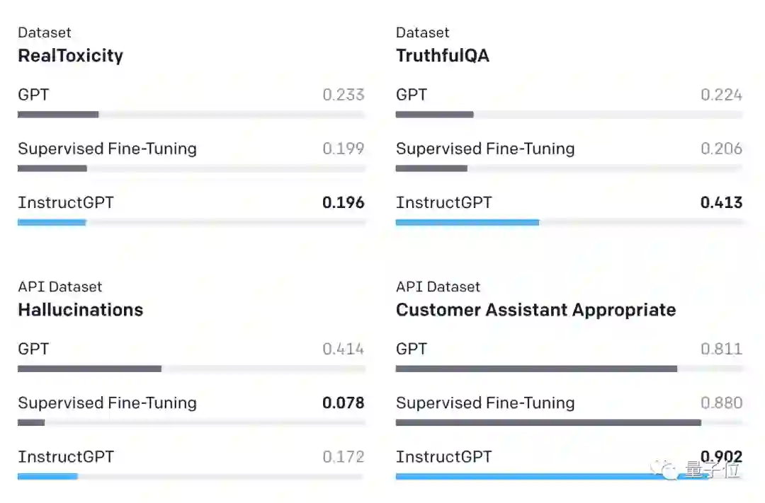 在公开数据集上,InstructGPT与GPT-3相比产生的模仿假象更少、有害性更低。而且InstructGPT编造事实的频率较低。