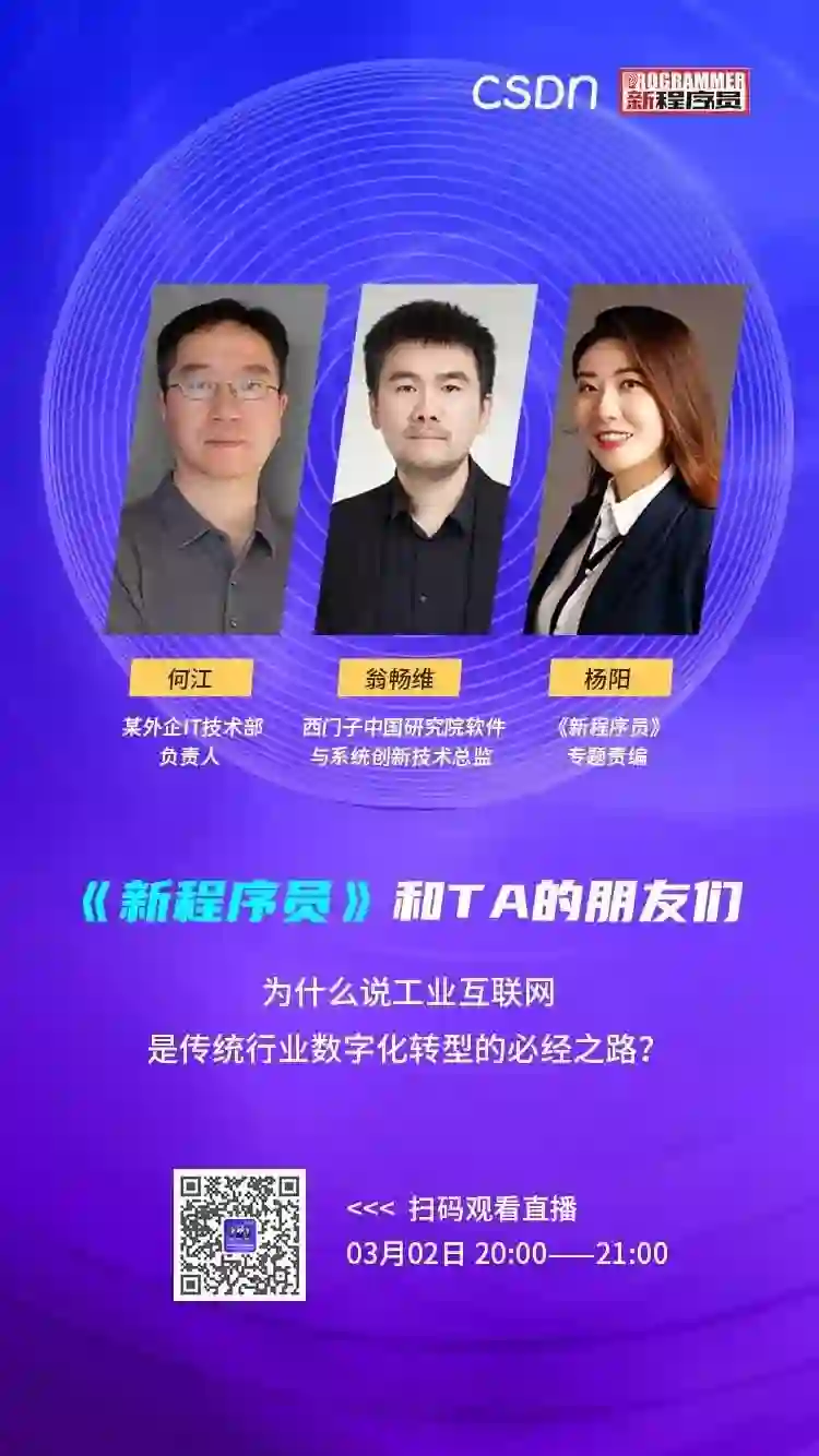 《新程序员003:云原生和全面数字化实践》(以下简称《新程序员 003》)自上市以来,为了加深作者与读者朋友的交流,方便读者更好理解文章内容、借鉴经验、应用方法,我们推出了「《新程序员》和TA的朋友们」系列直播连麦活动,目前已推出四期,七位专家与读者朋友见面。本期第五场——「为什么说工业互联网是传统行业数字化转型的必经之路?」在今晚20:00点如约而至。