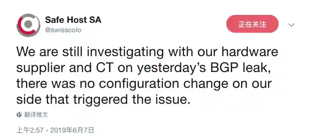 Safe Host在推特上写道:“我们仍在与我们的硬件供应商和CT一起调查昨天的BGP泄露,我们这边并没有进行引发这个问题的配置变更。”