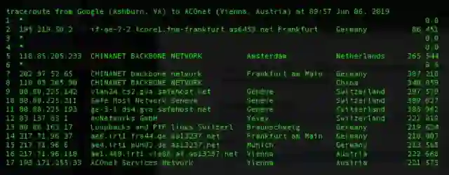 结果是:原本发送到使用受影响的IP地址的电信提供商的流量大部分通过中国电信的设备来传输,然后或被发送到最后一站,或在绕道引起的长时间等待中被丢弃。Oracle的安全分析师Doug Madory最先报告了这次泄露,他所做的路由跟踪显示了传输路径绕了多大的圈子。以下屏幕截图显示了从弗吉尼亚州的谷歌云服务器开始的流量通过中国电信的骨干网络传输,最终传输到位于奥地利维也纳的目标IP地址。