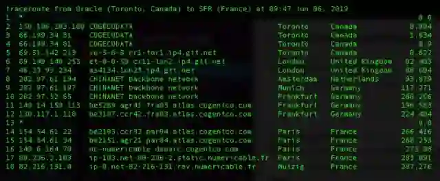 第二个屏幕截图显示了多伦多的Oracle数据中心与法国受影响的IP地址之间的类似路由。
