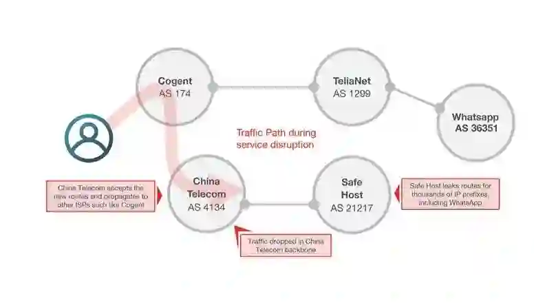 受周四事件影响的网络包括瑞士Swisscom的AS3303、荷兰电信公司KPN的AS1136以及分别属于法国电信提供商Bouygues Telecom和Numericable-SFR的AS1130和AS21502。 KPN后来指责这次事件是导致许多荷兰消费者无法完成借记卡交易的服务故障的根本原因。网络情报服务ThousandEyes的研究人员表示,发送到Facebook旗下的WhatsApp消息服务的一些流量也受到了影响。