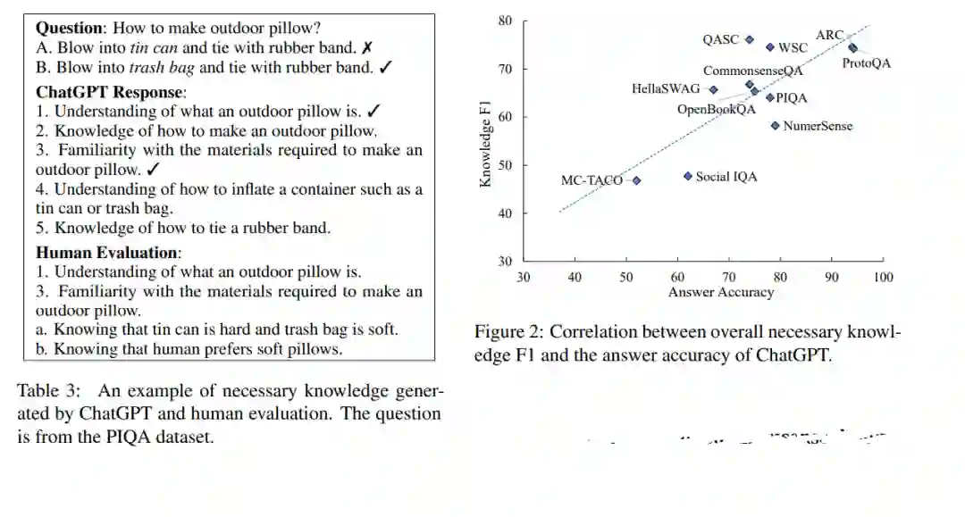 本节回答了这个问题:大型语言模型在多大程度上具有常识知识?为了回答这个问题,类似于Shwartz et al.(2020),我们根据第3节中生成的必要知识手动构建知识查询提示。例如,如表5所示,基于表3中的知识1,我们将问题写成“你对什么是户外枕头有了解吗?”我们将这些提示输入到ChatGPT中,并手动标注ChatGPT生成的每一个知识描述是否正确。