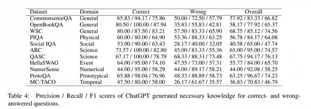 ChatGPT是一个没有经验的问题解决者,它很难精确地识别回答特定问题所需的常识知识。我们手动评估ChatGPT生成的必要知识,结果如表4所示。结果显示,在大多数常识性QA数据集上,总体F1分数在40%到75%之间。这些结果表明,ChatGPT是一个经验不足的问题解决者,无法准确识别回答特定常识问题所需的知识。