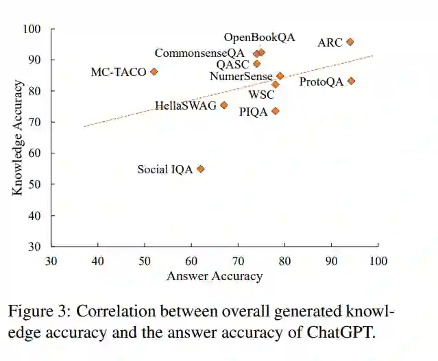GPTs知识渊博,包含了准确回答问题所需的大部分常识知识。通过提出知识-查询问题和手动评估ChatGPT的响应,我们评估了ChatGPT中必要知识的准确性。表6的结果显示,ChatGPT生成的知识描述在大多数常识性QA数据集上都能达到70%以上的准确率,达到82.66%的平均准确率。这表明,在给定知识查询问题的情况下,ChatGPT可以生成准确的常识知识描述。这表明llm可以作为常识知识库,并为下游任务提供常识。然而,在社会领域的准确率较低,为54.92%。我们认为,这是因为社会常识,如“接受帮助的人,而不是给予帮助的人,应该说谢谢”,在文本中并不常见。这就突出了开发具体指导的重要性,可以指导ChatGPT获取社会常识知识。