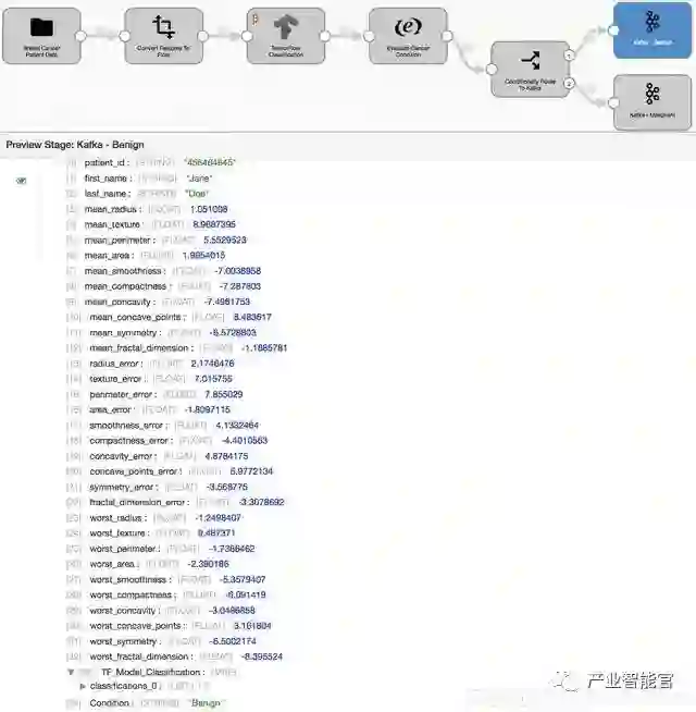 在预览管道上,乳腺癌数据记录的输入通过了上面所述的数据流管道过程,包括服务于我们的TensorFlow模型。发送给Kafka生产者的最终输出记录数据(如上所示)包括用于分类的模型所使用的乳腺癌特征,在用户定义的字段TF_Model_Classification中模型输出值为0或1,以及由Expression Evaluator创建的Condition字段中表示相应的癌症状况是良性或恶性。